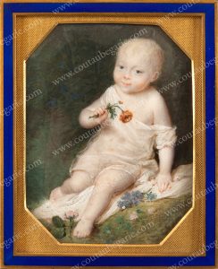 ECOLE FRANCAISE DE LA FIN DU XVIIIe SIECLE. Portrait enfant de Nathalie de Montalembert en 1797. Miniature sur ivoire, de forme rectangulaire, conservée sous verre dans un encadrement en métal doré orné d'une bande émaillée bleu. Bon état. A...
