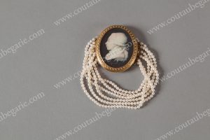 SAUVAGE Piat-Joseph (1744-1818) Portrait d'homme en buste de profil. Miniature sur ivoire en grisaille, de forme ovale, conservée sous verre, montée en bracelet avec six rangs de petites perles, signée au centre. Monture en or. Bon état. A vue :...