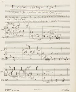 Il faut y ajouter des contrepoints de rythmes, des séries de timbres, de hauteurs et d’intensités, quelques embryons de neumes, tous ces procédés articulés dans un esprit familier aux sériels. […]