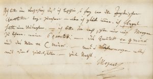 « Je vous prie d’excuser la liberté que j’ai prise tout récemment de vous enlever les Quatuors de Haydn – mais je crois toujours, rustre que je suis, pouvoir faire exception. – Je vous prie bien poliment de me prêter jusqu’à demain mes 6 quatuors, – le Quintette en sol mineur et le nouveau en ut mineur. – je vous rendrai le tout après-demain avec mes remerciements. –