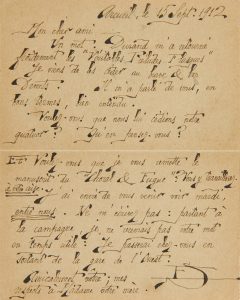 Et voulez-vous que je vous remette le manuscrit du Choral & fugue ? Vous y travaillerez à votre aise. J’ai envie de vous voir mardi, entre nous. Ne m’écrivez pas : partant à la campagne, je ne recevrais pas votre mot en temps utile : je passerai chez vous en sortant de la gare de l’Ouest... » [Il s’agit d’un projet de transcription pour quatuor qu’effectuerait Montfort d’un Choral & Fugue de Satie écrit en 1908 ; mais Satie s’apercevra plus tard qu’il en a perdu le manuscrit.]