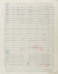Le manuscrit est à l’encre noire sur papier à 32 lignes ; il est signé et daté en fin « Coutras, 12 oct. 1948 » ; il a servi de conducteur et porte de nombreuses annotations au crayon rouge ou bleu. L’orchestre comprend : flûte (et piccolo), hautbois (et cor anglais), clarinette, basson, cor, trompette, tuba, timbales, percussion, harpe, piano, et les cordes.