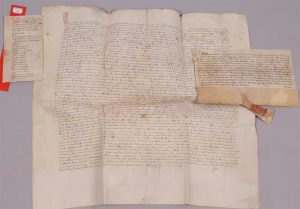 BERRY. 1350-1400. (4 pièces) (Joursanvault n°2771). 1. Titre de transaction sur les dimes entre Philippe Pelorde, abbé de Saint-Ambroise de Bourges, le prieur de Michevant et Jean de Clameci, alias Péron, bourgeois de Bourges ; le dimanche...