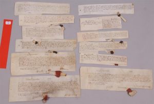 11. 1363 5 septembre Sachent tous que je Guérin Lesclancher garde des hommes et fames de corps (…) en la terre de Saint Aignan et de Celles en Berry cognais avoir eu et receu de mon chr et doubre seigneur monsieur le comte de Blois par la main Jehan Largent son receveur pour mes gages… (Parchemin 23 x 4 cm. ; petit sceau montrant un dextrochère tenant un cœur fiché en pointe, cantonné de deux fleurs de lys !)