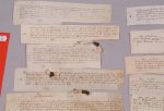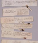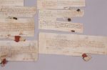 9. 1351 : Je Pierre Darchengier, garde des homes et fames de corps mon seigneur Monsieur de Blois es (prince) de berry recognait avoir eu et receu de Jehan deschamps son receu debt la somme de () livres tournois pour mes gages du dit office . Le 23e jour de février 1351. Parchemin 20 x 7 cm.