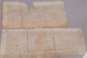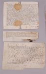 2. Reçu pour Jean humbles abbé de Baugerois, signé de son sceau en partie conservé et très ouvragé février 1370 : titre concernant la rente assignée à l’abbaye de Beaugerais, sur le péage de Saint-Aignan. Parchemin 26,5 x 8 cm., reste de deux sceau sur lacets.