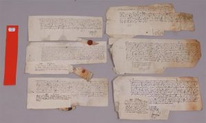 8. 20 juillet 1419. Pierre de Mornay dit Gaulu et conseiller chambellan et maréchal du duc d’Orléans reçoit de Renaud de Faveroy maître des eaux et forêts du comté de Blois 15 pieds de chêne pour les réparations du château de la Ferté Hubert. Parchemin 32,5 x 9,5 cm. ; Scellé de son sceau : (Morceau de sceau rouge montrant écu penché sommé d’un homme, support deux lions ? – voir n° 10 :