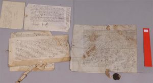 3. 29 mars 1445 Lettres de Charles duc d’Orléans sur la vente de la terre de Saint Agnan faite par Louis et Hugues de Chalons ses cousins Jean Souvenet président en Parlement (St Aignan en Berry) Parchemin 39 x 28,5 cm. ; Sceau en cire noir de la prévôté, très bien conservé au recto et verso montrant on écu à une bande.)