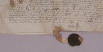 4. 15 juin 1441 « À tous ceux qui des présentes lettres verront, (Mathurons) Bazin, bourgeois d’Argenson et garde du scel aux (antrans) establi en la ville et châtellenie d’Argenson pour et noble et puissant seigneur monsieur de Chauvigny de chastel (Rouly ) vicomte de (Broux ?) … la chastellenie d’Argenson () Sachent tous que devant Guillaume Aubontet notaire Juré en l’office du dit scel en droit et () éstabli, noble femme jacquete de la Chastre dame de Solon veuve de feu noble homme Helion de Croiz en son vivant escuyer et seigneur dudit selon, laquelle noble de sa bonne volonté et étant () confesse que elle est bien contente de la main mise par les gens et officiers de très haut et puissant prince monsieur le duc d’Orléans (…) ». Parchemin 36 x 17,5 cm.