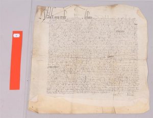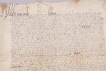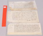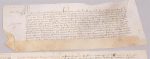 Joint 3 autres pièces sur parchemin concernant le même lieu, des 22 juillet 1421 (pièce de 32 x 11 cm.), 19 octobre 1422 (pièce de 31 x 14 cm.) et du 14 mai 1425 (pièce de 30 x 11,5 cm.).