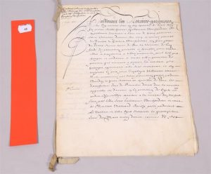 (PARIS). 6 juillet 1660. Contrat d’achat de maisons rue de Bievre, à Paris, pour Charles Bouchardeau représenté par son frère Guillaume ; grevées d’un cens pour l’Abbaye Ste-Geneviève du Mont. 10 pages in-4 sur parchemin. Charles...