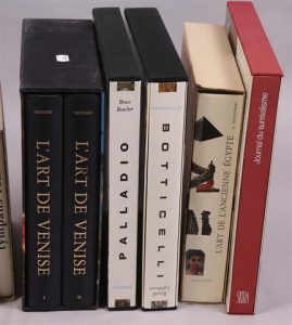 (ART) 15 volumes in-4, reliures éditeur, jaquettes : Mazenod-Citadelle. 3 volumes : Palladio – Botticelli – Art ancienne Egypte. / Skira. Journal de l’impressionnisme. Etui. / ROMANELLI. L’art de Venise. 2 volumes sous un étui. / Univers...