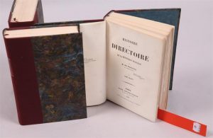 BARANTE (M. de). Histoire du Directoire de la République française. Paris, Didier, 1855, 3 volumes in-8 reliés demi-percaline lie-de-vin, pièces de titre basane noire, couvertures conservées.