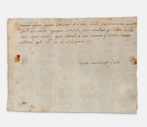 → Le rédacteur de ce catalogue a mal lu le nom du destinataire et d'ailleurs n'a absolument rien compris à cette lettre. Il ne s'agit pas, en effet, d'une «prochaine arrivée» mais d'un envoi de becfigues [sorte d'ortolans] pour régaler Francesco Del Nero.