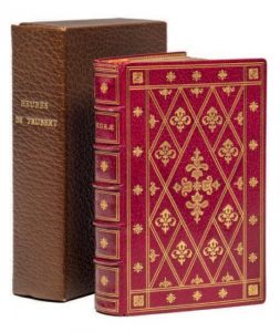 Reliure de la fin du XIXe siècle, plein maroquin rouge, décor symétrique des plats à double filets croisés au centre et encadrement aux petits fers, dos à nerfs soulignés de petits pointillés, caissons à double filets dorés ornés de fleurons, titre doré, double filet doré sur les coupes, doublures de maroquin blanc au semé de fleurs de lys dorées, gardes de tabis moiré crème, tranches dorées (rel. signée L. Curmer (contre-plat supérieur) et dorure de C. Maillard (contre-plat inférieur); quelques rousseurs sur les gardes).