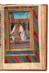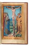 127 ff., précédés et suivis de 4 ff. de garde de parchemin moderne, complet (collation: i6, ii10, iii-viii4, ix-xvi8, xvii5), écriture en lettre bâtarde à l'encre brune, texte sur une colonne, 19 lignes de texte, réglure à l'encre rouge, rubriques en rouge, bouts-de-ligne en rouge foncé ou bleu avec décor doré, initiales d'une ou deux lignes de hauteur à l'or liquide sur fonds rouge foncé ou bleu, avec décors dorés, initiales de 3 à 4 lignes de hauteur en rose avec rehauts blancs avec décor floral, sur fonds rouge avec décors dorés, 17 miniatures, dont 12 à trois-quarts de page et 5 à pleine page, bordures enluminées, la plupart avec feuilles d'acanthe, fleurs, fruits et grotesques ou bestiaire sur fonds d'or, les bordures des miniatures à pleine page étant soit des encadrements architecturés avec aplats de couleur soit des bordures à bandes rayées colorées.
