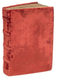 Reliure moderne de velours rouge cramoisi, dos à 4 nerfs, gardes anciennes, tranches dorées. Dimensions: 120 x 176 mm.
