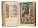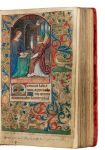 (16 petites miniatures et 7 grandes) et à un atelier parisien (émule de Jean Pichore ?) 147 ff., manque trois feuillets (après 62, 73 et 102, ancienne foliotation), écriture gothique à l'encre brune, sauf pour le calendrier (17 lignes) en lettres rouges bleues ou or, parchemin réglé à l'encre rouge pâle, 18 lignes à la page, écriture à l'encre brune, initiales ornées à l'or liquide sur fonds bleu ou rouge foncé, bouts-de-ligne de même ou figurés par des bois écotés dorés, initiales d'une hauteur de 2 lignes en bleu rehausssé de blanc ou or sur fonds rouge, bleu, ou or parfois avec motifs floraux, plus grandes initiales de couleur marquant les grandes divisions liturgiques sur fonds rouge et bleu avec parfois motifs zoomorphiques (e.g. ff. 44v, 77), bordures enluminées à toutes les pages (baguette latérales seules pour les feuillets de texte) avec feuilles d'acanthe colorées sur fond à l'or liquide ou fond réservé avec fleurs et grotesques, avec 12 grandes miniatures et 16 petites miniatures.