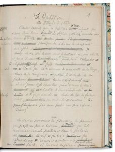 Manuscrit de premier jet au crayon et à l'encre titré, folioté et comportant des ratures et corrections.