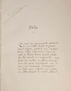 Un ensemble de 34 stèles (54 pages) une première série en partie numérotée par Segalen correspondant à l'envoi sur papier fort et constituant un avant-projet de 19 stèles organisé dans un ordre totalement différent de celui qui allait être ensuite définitivement adopté