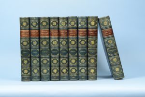 Théâtre complet. Paris, Calmann Lévy, 1890-1893. (7 vol.). – Théâtre des autres. Ibid., id., 1894. (2 vol.). Ensemble 9 volumes in-8, maroquin bleu roi, double filet doré, dos orné de masques dorés contenus dans une couronne de laurier, le tout encadré de filets dorés, tête dorée, non rogné, couverture et dos (Gebrüder Hug). Luxueuse édition du théâtre de Dumas fils, accompagnée de préfaces inédites et illustrée d'un portrait de l'auteur, 17 frontispices, 7 vignettes en-tête et 7 culs-de-lampe par Alcide Théophile Robaudi gravés à l'eau-forte par E. Abot. Elle est suivie dans cet exemplaire de la première édition collective du Théâtre des autres, recueillant les pièces écrites en collaboration ou remaniées par Dumas fils, qui est illustrée quant à elle de 10 compositions de Robaudi gravées à l'eau-forte par L. Ruet. Les deux volumes de notes du Théatre complet n'ont pas été joints à l'ensemble. Un des 135 exemplaires sur grand papier vergé. Séduisant exemplaire en maroquin bleu superbement exécuté par les frères Hug, relieurs suisses. Dos passés, légères taches sombres sur les plats.