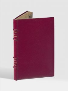 Fac-similé des premières pages de l'édition originale de La Fille Élisa ornées d'aquarelles et croquis de H. de Toulouse Lautrec. Paris, Librairie de France, 1931. In-12, maroquin rouge janséniste, double filet doré intérieur, doublures et gardes de moire rouge, couverture, tranches dorées, étui assorti (Creuzevault). Reproduction en fac-similé des 57 premières pages d'un exemplaire de La Fille Élisa orné de seize aquarelles de Toulouse-Lautrec. Cet exemplaire unique, reproduit par Daniel Jacomet pour la Librairie de France, appartenait à la collection Maurice Joyant. L'ouvrage est accompagné d'une brochure introductive reliée à la suite du fac-similé. Tirage à 200 exemplaires paraphés par l'éditeur. Superbe exemplaire parfaitement relié par Creuzevault.
