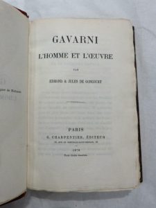Gavarni. L'homme et l'œuvre. Paris, G. Charpentier, 1879. In-12, demi-chagrin rouge, dos orné de fleurons dorés, non rogné (Reliure de l'époque). Édition en partie originale. Un des 3 exemplaires de tête sur chine, probablement réservés aux auteurs et non justifiés. De la bibliothèque Léon Le Roy. Exemplaire lavé et replacé dans sa reliure, contregardes renouvelées et gardes ajoutées. Reliure usée avec manque en coiffe de tête.