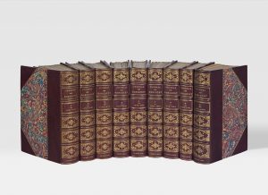 Journal. Paris, Charpentier & Cie, 1887-1896. 9 volumes in-8, demi-maroquin bordeaux avec coins, dos orné, tête dorée, non rogné, couverture (Thierry). Édition originale, très recherchée sur grand papier. Un des 50 exemplaires numérotés sur hollande, après 10 japons. Très bel exemplaire relié par Thierry, le successeur de Petit-Simier. Les deux plats de couverture des tomes I-III, le plat inférieur du tome IV et le plat supérieur du tome VI n'ont pas été conservés.