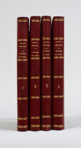 Alfred et Liska, ou le hussard parvenu. Roman historique du XVIIe siècle. Paris, Imprimerie de Chaignieau Ainé, an XII – 1804. 4 volumes in-12, demi-basane rouge, dos lisse orné de filets dorés, tranches mouchetées (Reliure de la seconde moitié du XIXe siècle). Édition originale rare. Elle est ornée de quatre frontispices gravés par Jeanne-Louise Vallain, dite Nanine Vallain (1767-1815), élève de Jacques-Louis David. Les catalogues en ligne ne recensent que deux exemplaires de cet ouvrage : à Cherbourg et à la bibliothèque nationale de Pologne.