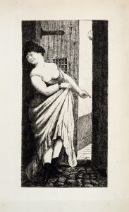 La Fille Elisa. Scène d'atelier en un acte par un auteur bien connu. Rome, Au temple de Vénus [Paris, vers 1880]. Plaquette in-8, bradel demi-percaline à coins, non rogné, couverture (Carayon). Édition originale de cette parodie érotique du roman d'Edmond de Goncourt, publiée clandestinement et tirée à très petit nombre sur papier vergé. Elle est ornée de deux belles eaux-fortes anonymes en frontispice. Vicaire, III, 712 – Gay, 307 – Dutel, 302.