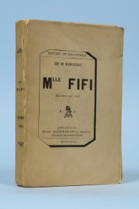 Mademoiselle Fifi. Bruxelles, Henry Kistemaeckers, 1882. In-16, broché. Édition originale, ornée d'un portrait de l'auteur gravé à l'eau-forte par Just. L'ouvrage a été imprimé à petit nombre sur papier vergé. Dos fendu.
