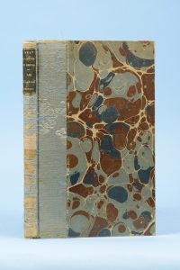 Le Chariot d'enfant. Drame en vers, en cinq actes et sept tableaux. Traduction du drame indien du Roi Soudraka. Paris, D. Giraud et J. Dagneau, 1850. In-12, demi-toile bleu ciel brochée de soie bleue, argentée et dorée, non rogné, couverture (Pierson – Henry Joseph). Édition originale. Manques de tissu sur le dos et les coiffes, rousseurs.
