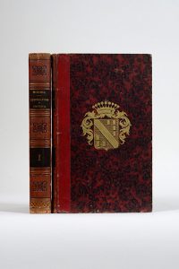 Mélange de littérature et de critique. Paris, Raymond, 1820. 2 volumes in-8, demi-veau rouge, armes dorées au centre, dos lisse orné, tranches mouchetées (Reliure de l'époque). Édition originale. Exemplaire enrichi d'un portrait photographique et d'une lettre autographe signée de l'auteur, datée d'octobre 1843 et adressée au chevalier d'Auriol. De la bibliothèque Charles de Mandre (1805-1875), avec ex-libris et ses armes sur les plats. Dos légèrement passé, petits frottements aux plats.
