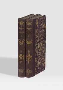 Lélia. Paris, Henri Dupuy, L. Tenré, 1833. 2 volumes in-8, demi-chagrin brun avec coins, dos lisse orné de fleurons rocaille dorés, tranches marbrées (Reliure de l'époque). Édition originale. Lélia est, avec Indiana, un des ouvrages de cet auteur les plus rares et les plus estimés, d'après Carteret. Ce drame gothique, qui consacra la réputation d'écrivain de George Sand, eut une grande influence sur l'écriture des sentiments et l'analyse psychologique dans le roman européen. Agréable exemplaire en reliure romantique, sans mention fictive d'édition et comportant, comme il se doit, les vers d’Alfred de Musset au début du second tome. Ex-libris manuscrit ancien en haut des titres. Menus frottements aux reliures, quelques rares piqûres. Carteret, II, 306 – Clouzot, 242.
