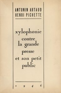 Xylophonie contre la grande presse et son petit public. S.l.n.n., 1946. In-8 de [8] ff., couverture comprise, en feuilles. Très rare plaquette tirée à 53 exemplaires sur vélin fort. Elle contient deux texte : Histoire entre la Groume et Dieu d'Antonin Artaud et Apoème d'Henri Pichette.