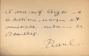 La Danse de Sophocle. Paris, Mercure de France, 1912. In-12, broché. Édition originale. Troisième recueil de vers publié par Cocteau, La Danse de Sophocle porte la marque de la comtesse de Noailles, dont l'œuvre était encore, en 1912, la principale influence du « Prince de la Jeunesse ». En 1963, trente ans après sa disparition, c'est à elle que Cocteau consacra son dernier ouvrage, La Comtesse de Noailles, oui et non. Précieux exemplaire offert par Jean Cocteau à Anna de Noailles, son amie et mentor, avec ce bel envoi autographe signé : À ma nef Argo – à la sublime, unique et multiple Madame de Noailles. Jean C.
