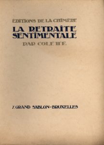 Ensemble onze ouvrages. La Retraite sentimentale. Bruxelles, La Chimère, 1922. In-8, broché. Illustrations en ocre de Robert Bonfils. Un des 150 exemplaires sur vergé d’Arches. Claudine en ménage. – Claudine à Paris. – Claudine s’en va. – Claudine à l’école. Paris, Henri Jonquières, 1924-1925. 4 volumes in-8, brochés. Illustrations de Chas Laborde coloriées au pochoir. Exemplaires sur vélin de Rives. Le Voyage égoïste. Paris, Ferenczi, 1928. In-12, broché, à toutes marges. Édition originale. Un des 215 exemplaires sur pur fil. La Seconde. Paris, Ferenczi, 1929. In-8, broché, non coupé, à toutes marges. Édition originale. Un des 110 exemplaires sur japon impérial. La Seconde. Paris, Ferenczi, 1929. In-8, broché, non coupé, à toutes marges. Édition originale. Exemplaire sur alfa. Sido. Paris, Ferenczi, 1930. In-12, broché. Exemplaire sur vélin bibliophile. Supplément à Don Juan. Paris, Trianon, 1931. In-16, broché. Édition originale, ornée de quatre cuivres et un bois gravés par Gérard Cochet. Exemplaire sur vergé de Rives. On joint, de plus, un second exemplaire de Supplément à Don Juan (couverture décollée).