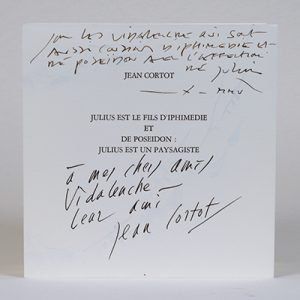 Julius est le fils d’Iphimédie et de Poséidon : Julius est un paysagiste. New Haven (Connecticut) ; Wequetecock Cove, juin 2005. Plaquette in-12 carré (150 x 150 mm) de 1 f. blanc, dépliant en 6 volets à versos blancs, 1 f. blanc, couverture à rabats. Édition originale ornée d’une encre à pleine page de Julius Baltazar reproduite au cliché-trait. Tirage à 150 exemplaires sur papier vélin Rivoli. — Un des 30 exemplaires du tirage de tête comportant une aquarelle originale à double page de Baltazar (annoncée comme « aquabaltazarelle »), signés par l’auteur et par l’artiste. Dédicaces autographes sur la page de titre : « Pour les Vidalenche qui sont aussi cousins d’Iphimédie et de Poséidon avec l’affection de Julius. X-MMV » ; et : « à mes chers amis Vidalenche leur ami Jean Cortot ». Joint une invitation à la remise de médaille de chevalier des Arts et des Lettres à Julius Baltazar (15 octobre 2006), entièrement aquarellée et signée par ce dernier. Exposition Salah Stétié et les peintres, Sète, Musée P. Valéry, 2013.