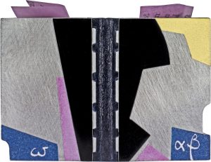 Reliure métallique recouvrant un amas de feuillets de papier fin violine imprimés et pliés fixés sur les contreplats qui, à l’ouverture du livre, donnent naissance à une structure en papier fripé en trois dimensions recouvrant un texte inintelligible. Sans lieu, ni date. In-24 (73 x 50 mm), reliure à plats rapportés constitués de plaques de métal arasé, de plastique noir, de carton jaune, bleu, rose, dos de basane noire, étui-boîte de toile bleue de grand format dans lequel se loge la reliure (242 x 120 mm). (C[laude] D[ebras]. 2010). Livre minuscule ou livre-nain à transformation. Il contient un texte avec lettres imprimées dans le désordre sur des fragments de papier pliés qui font surgir des formes à l’ouverture des deux plats. La reliure métallique de Claude Debras porte, à l’angle du plat supérieur, les lettres grecques α (alpha) et ß (bêta) et, à l’angle du plat inférieur, ω (oméga), ces trois lettres indiquant peut-être ainsi le titre.