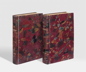 La Vie des insectes. Paris, Delagrave, s.d. – Les Ravageurs. Paris, Delagrave, s.d. 2 volumes in-12, bradel papier-cuir japonais (kami-kawa), plats entièrement estampés d’un décor polychrome de fleurs et d'insectes, dos lisse, doublures et gardes de papier décoré, non rogné, couverture et dos (E. Carayon). La Vie des insectes est une compilation d'extraits choisis des Souvenirs entomologiques de l'auteur, illustrée de 15 gravures et 11 planches hors texte. L'exemplaire a une mention de troisième édition sur le titre. Les Ravageurs, recueil de récits sur les insectes nuisibles à l'agriculture, renferme 16 planches hors texte. Séduisant exemplaire en reliures japonisantes décorées de fleurs, de sauterelles et de papillons colorés, signées d'Émile Carayon, le maître incontesté de cette spécialité. « Prônée par Edmond de Goncourt, la reliure en papier-cuir, le kami-kawa, est l’un des modes de la reliure japonisante. Le décor s’y réduit à des fleurs et à un fond uniforme de couleur sombre, délaissant toute intention de scène ; c’est le symbole du pays centré sur son épure. On appelle parfois ce type de reliure “cartonnage des Goncourt” » (Yves Peyré, Histoire de la reliure de création, p. 124). Ex-libris HH à la devise Livre faict vivre.