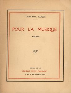 Pour la musique. Poëmes. Paris, Nouvelle Revue Française, 1914. Petit in-4, broché. Édition originale, en second tirage, publié le 1er mars 1914 à 100 exemplaires sur vergé d'Arches. Le premier tirage de l'édition avait été récusé par l'auteur, et presque entièrement détruit, parce que deux vers du poème Intérieurs n'y avaient pas été imprimés ; il est d'une insigne rareté. Ce recueil de poèmes dédié à Francis Jourdain reprend les dix Chansons basses parues dans la revue Le Recueil pour Ariane (1912), augmentées d'une Romance inédite. Envoi autographe signé de Léon-Paul Fargue à Mme André Suarès. Couverture décollée.