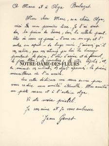 Notre-Dame-des-Fleurs. Monte-Carlo [Paris], aux dépens d'un amateur [Robert Denoël et Paul Morihien], s.d. [1943]. Petit in-4, broché, étui cartonné. Édition originale du premier roman de l'auteur, publiée clandestinement par Paul Morihien, le secrétaire de Cocteau, associé à Robert Denoël. Elle a été tirée à 350 exemplaires sur vélin réservés aux souscripteurs. Très précieux exemplaire offert par Jean Genet à ses éditeurs Marc et Olga Barbezat avec ce magnifique envoi autographe signé : À Marc et à Olga Barbezat, Mon cher Marc, ma chère Olga, voici [biffé : le] mon premier livre. Je l'ai écrit dans la prison de Fresnes, dans la cellule peut-être où vous avez passé – l'une avec son corps et l'autre avec son esprit – de longs mois. J'aimerais qu'il vous redise, que vous retrouviez par lui la douceur pourtant des prisons, l'odeur d'urine et de formol, le jour bleu, les couvertures, les vitres dépolies, et, en suivant ces indications des objets réprouvés, la poésie merveilleuse où l'on arrive. Que cette dédicace me serve encore pour vous redire mon amitié éternelle. Mon amitié au poète Marc et à l'actrice Olga. Vi ste moia priatel Je vous aime et je vous embrasse Jean Genet Genet fait référence, dans cette dédicace, à l’arrestation d’Olga Barbezat par la Gestapo, le 10 février 1944, suivie de son incarcération à la prison de Fresnes, où elle demeura internée jusqu’en juin. Ce séjour en prison interdit à la jeune actrice de jouer dans Huis clos, dont Sartre avait écrit les deux rôles féminins pour elle et Wanda Kosakiewicz (voir le lot n°271). Couverture décollée et légèrement brunie.