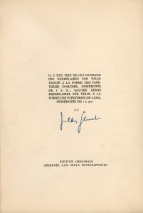 Journal du voleur. S.l. [Genève], aux dépens d’un ami [Albert Skira], s.d. [1948]. In-4, en feuilles, couverture lithographiée, étui d'édition. Édition originale, dédiée à Jean-Paul Sartre et Simone de Beauvoir. Publiée clandestinement par Albert Skira, elle a été tirée à 410 exemplaires réservés aux souscripteurs. Un des 400 exemplaires sur vélin de Lana, signé de l'auteur.