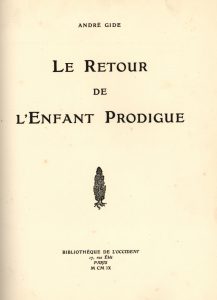 Le Retour de l'enfant prodigue. Paris, Bibliothèque de l’Occident, 1909. In-4, demi-maroquin à long grain noir avec coins, doubles filets dorés, dos orné de même, tête dorée, non rogné, couverture (Morrell, London). Première édition en librairie, parue deux ans après le rare tiré à part de la revue Vers et Prose. Tirage unique à 100 exemplaires sur vergé d’Arches.
