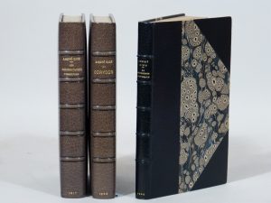Ensemble trois ouvrages. Les Nourritures terrestres. Paris, NRF, 1917. In-12, maroquin janséniste gris souris, doublures de maroquin bordeaux, gardes de moire grise, tranches dorées sur témoins, couvertures et dos, étui (Semet & Plumelle). Seconde édition. Un des 300 exemplaires sur Rives, seul grand papier. La Symphonie pastorale. Paris, NRF, 1919. Petit in-12, demi-maroquin bleu avec coins, tête dorée, non rogné, couverture et dos (Devauchelle). Édition originale. Un des exemplaires sur vélin Lafuma réservés aux Amis de l'édition originale. Couverture et dos à la la date de 1920. Petites usures au dos. Corydon. Paris, NRF, 1924. In-12, maroquin janséniste gris souris, doublures de maroquin bordeaux, gardes de moire grise, tranches dorées sur témoins, couvertures et dos, étui (Semet & Plumelle). Première édition mise dans le commerce. Un des 550 exemplaires sur hollande van Gelder. De la bibliothèque Raoul Simonson (2013, II, n°509), avec ex-libris.