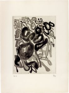 Foules. Texte de Jacques Gouttenoire, suite de 10 gravures de Bertrand Dorny. Paris, chez l’Artiste, 15 décembre 1962. Plaquette in-folio (380 x 285 mm) de [14] ff. dont quatre de texte et dix de planches, couverture muette, en ff, chemise et étui de toile grise. Édition originale accompagnée de 10 aquatintes originales hors texte de Bertrand Dorny dont c’est le premier recueil de gravures publié. Tirage à 32 exemplaires sur papier vélin de Rives. Joints à l’exemplaire : 1. Le cuivre original — rayé obliquement — de la gravure n° 2 2. Un texte autographe de Bertrand Dorny : « Triomphe du conformisme » (Compte rendu du XVe salon de la Jeune Peinture, 4 pages in-4). J.-P. Arnaud. Bertrand Dorny, Catalogue raisonné de l’œuvre gravé. 1962-1991. Paris, 2002, n° 1 a-j.