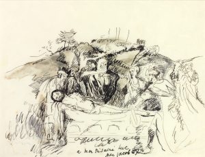 Dessin original signé. 1927. Encre noire et lavis de gris (21 x 27 cm), encadré. Beau et rare dessin original signé de Max Jacob représentant la mise au tombeau du Christ. Envoi autographe à Luc Dietrich sous le sujet, daté [19]27.
