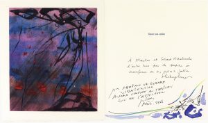 Sur Julius Baltazar peintre. New Haven (Connecticut), Editions Wequetecock Cove, premiers jours de mai 2005. Plaquette petit in-12 carré (150 x 150 mm) de 2 ff. blancs, [6] ff. repliés en accordéon avec versos blancs, 2 ff. blancs, couverture à rabats. Édition originale ornée de 2 « encres » à pleine page de Julius Baltazar reproduites au cliché-trait. Tirage à 180 exemplaires sur papier vélin de Rives signés par l’auteur et par l’artiste. — Un des 150 exemplaires numérotés de 31 à 180. Envois autographes sur le faux-titre : « Pour Gérard et Martine Vidalenche amis des livres et de la peinture ce texte que j’ai eu plaisir d’écrire sur la peinture d’un artiste authentique Laubiès » ; et : « Avec aussi l’amitiés de Julius. Nous passons tous deux trois jours à Marseille … ». — Joint : LAGET (Thierry). Semer son ombre. (Neuilly-sur-Seine), Al Manar, derniers jours de février 2008. Petit in-4 (220 x 190 mm) de [16] ff. les deux premiers et les deux derniers blancs, en feuilles, couverture aquarellée de ton violine avec large rempli. — Édition originale ornée de 2 eaux-fortes originales hors texte en couleurs de Julius Baltazar, pressées sur papier de Chine appliqué peint au préalable. — Tirage à 45 exemplaires sur papier vélin d’Arches signés par l’auteur et par l’artiste. Dédicaces autographes sur le faux-titre : « à Martine et Gérard Vidalenche l’ombre bue par le papier se transforme en or, grâce à Julius, Thierry Laget », et : « Pour Martine et Gérard Vidalenche aucune ombre au tableau que de l'affection Julius mai 2008 ». Petite composition aquarellée dans l'angle inférieur.