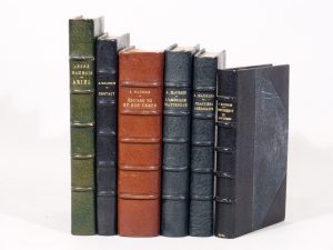 Ensemble six ouvrages. Ariel, ou la vie de Shelley. Paris, Émile-Paul frères, 1924. In-8, demi-maroquin vert avec coins, tête dorée, couverture et dos (H. Blanchetière). Première édition illustrée, ornée d'un frontispice en couleurs et de vignettes en noir par Hermine David. Exemplaire sur vélin de Rives. Mors légèrement frottés. Contact. Maastricht, Stols, 1928. In-8, demi-maroquin noir avec coins, tête dorée, couverture et dos (Reliure de l’époque). Édition originale, publiée dans la collection Les Belles Heures, avec un frontispice par Bernard Boutet de Monvel. Un des 50 exemplaires sur hollande avec le frontispice en double état. Coins émoussés, petit manque de papier sur un plat. L’Amérique inattendue. Paris, Mornay, 1931. In-12, demi-maroquin bleu nuit avec coins, tête dorée, couverture et dos (Reliure de l’époque). Édition originale, ornée d’un portrait de l’auteur par Berthold Mann. Un des 78 exemplaires de tête sur japon. Chantiers américains. Paris, Gallimard, 1933. In-12, demi-maroquin vert foncé avec coins, tête dorée, non rogné, couverture et dos (Reliure de l’époque). Édition originale, illustrée de photographies en noir et blanc. Un des 72 exemplaires de tête sur vélin de Hollande. Édouard VII et son temps. Paris, Éditions de France, 1933. In-12, demi-maroquin havane avec coins, tête dorée, non rogné, couverture et dos (Reliure de l’époque). Édition originale. Un des 37 exemplaires de tête sur japon impérial. Teinte du maroquin inégalement passée. Sentiments & coutumes. Paris, Grasset, 1934. In-12, demi-maroquin noir avec coins, tête dorée, couverture et dos (Reliure de l’époque). Édition originale. Un des 14 exemplaires sur japon impérial.