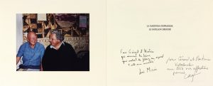 La Mariposa disfrazada. Le Papillon déguisé. Traduit de l’espagnol (Chili) par Zeno Bianu. Liancourt (Oise), Bernard Dumerchez, 30 novembre 2004. Plaquette in-4 oblong (190 x 235 mm) de 2 ff. blancs, [1] f. (photographie en couleurs fixée), 12 pp., [2] ff. (Planche ; Justification et Achevé d’imprimer) , [2] planches sous chemise, 2 ff. blancs, en feuilles, couverture à larges rabats. Édition originale du texte (imprimé en italique dans la moitié supérieure de chaque page) et de la traduction de Zeno Bianu (en romain dans la moitié inférieure). Elle est ornée de 2 lithographies originales hors texte de René Laubiès tirées sur papier de Chine appliqué. Tirage à 50 exemplaires sur papier vélin d’Arches tous signés par Luis Mizón et par René Laubiès. Un des 17 premiers exemplaires comprenant en suite à part les deux lithographies tirées sur Japon (appliqué sur Arches) et signées par Laubiès, et une photographie originale en couleurs prise par Julius Baltazar : Mizón et Laubiès riant. L’exemplaire contient en outre une composition originale, encre de Chine et aquarelle, signée de René Laubiès. Dédicaces autographes au crayon sur le faux-titre : « Pour Gérard et Martine qui aiment les livres qui volent de fleur en regard toute mon amitié Luis Mizón » ; « Pour Gérard et Martine avec toutes mes affectueuses pensées Laubiès ».